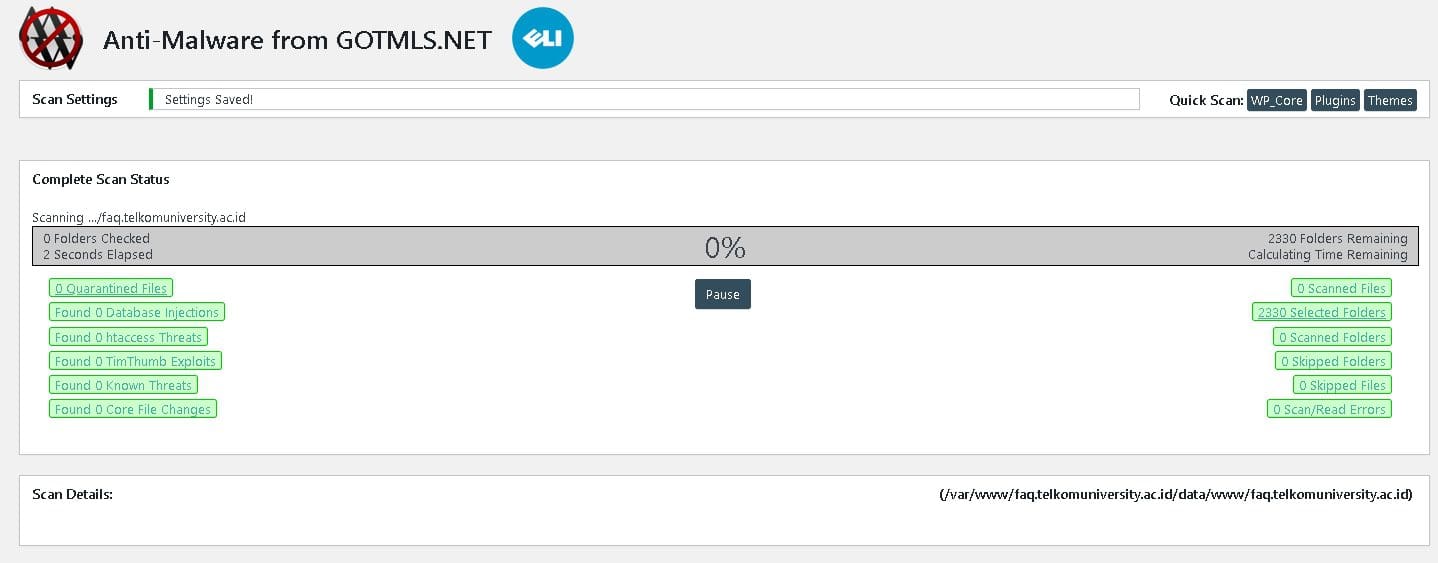 Anti Malware salah satu plugin standar keamanan wordpress di domain *.telkomuniversity.ac.id, plugin ini asalnya berlisensi gratis untuk digunakan, namun apabila ingin mendapatkan fitur auto update harus melakukan pembayaran. Untuk download plugin ini di https://wordpress.org/plugins/gotmls/
