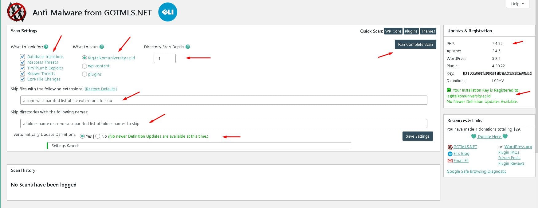 PuTI telah mendaftarkan lisensi plugin ini, sehingga disetiap menu konfigurasi plugin Anti Malware, harusnya ada notifikasi bahwa plugin sudah terregister.